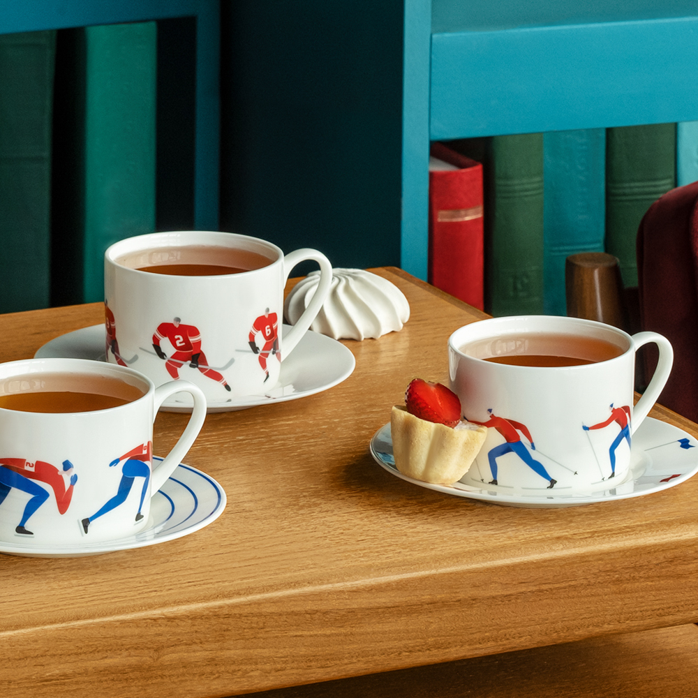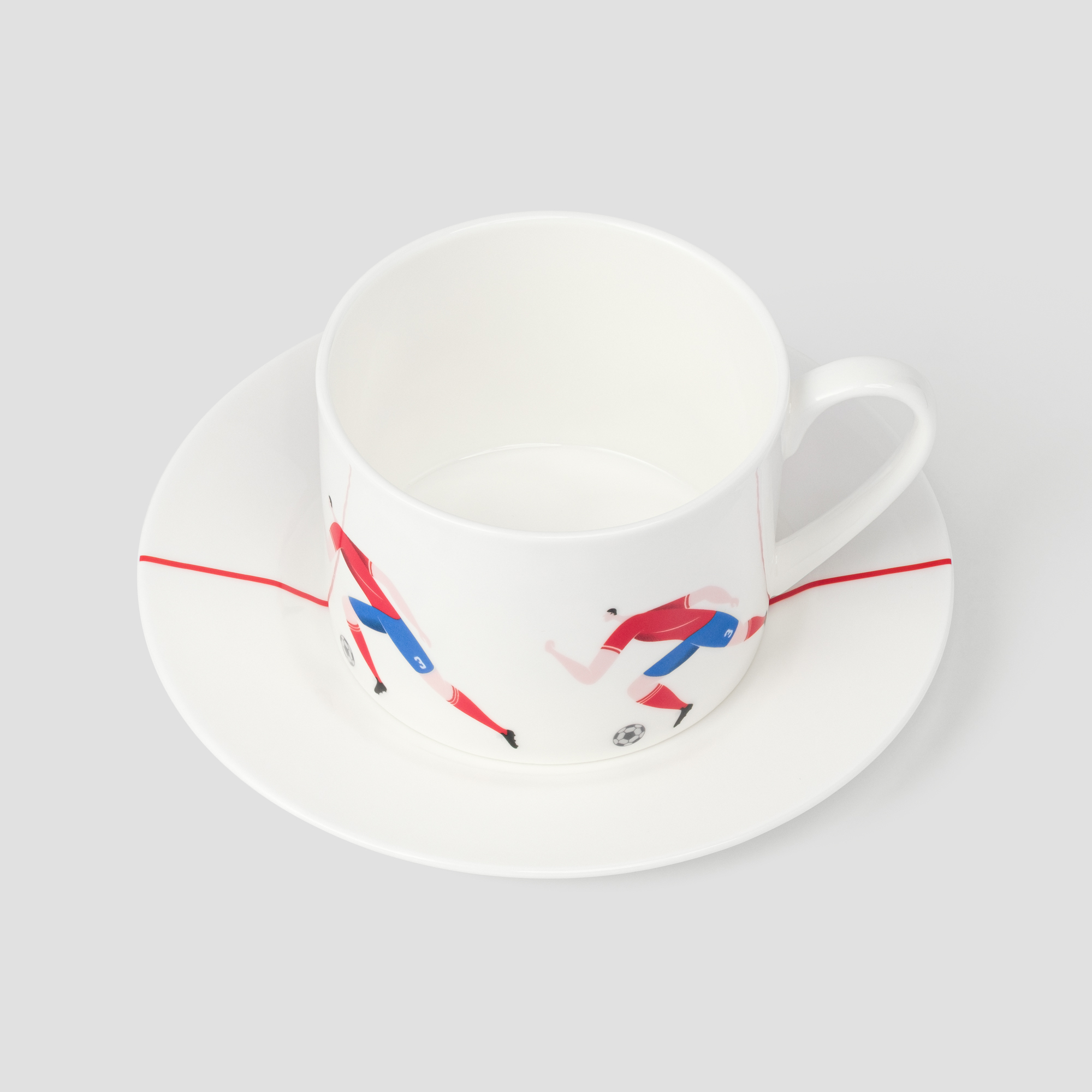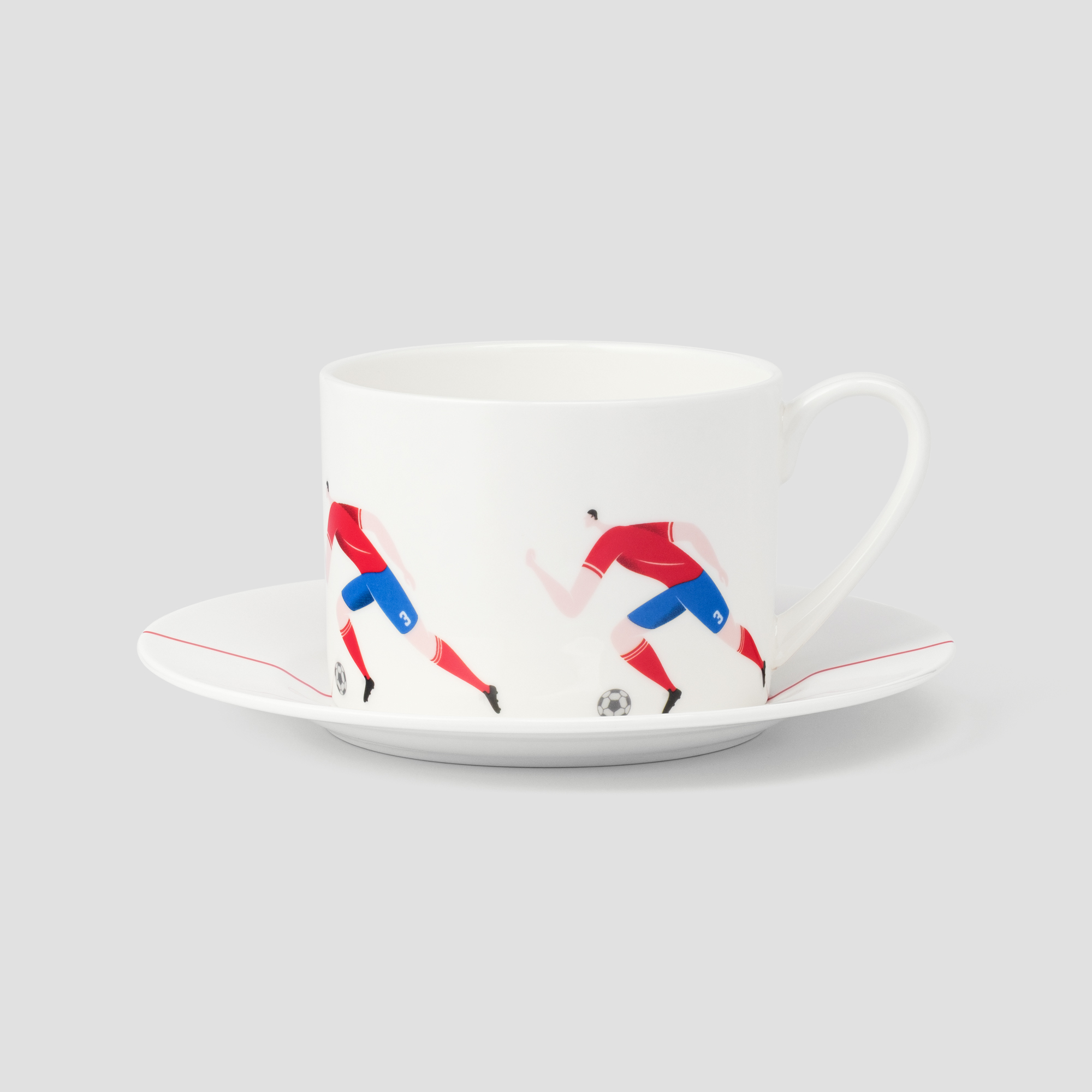 Чайная пара «Футболист» из коллекции «Спортсмены» поставляется в подарочной коробке «крышка-дно» с матовой ламинацией.