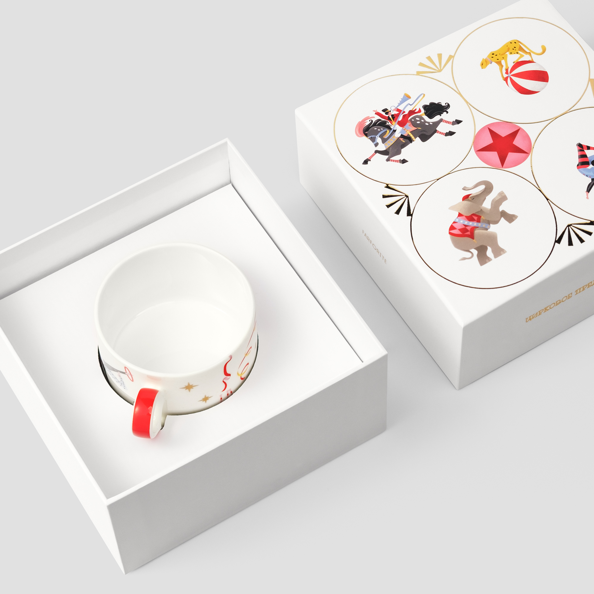 Чайная пара «Цирковое представление» из одноименной коллекции поставляется в подарочной коробке «крышка-дно» с матовой ламинацией.