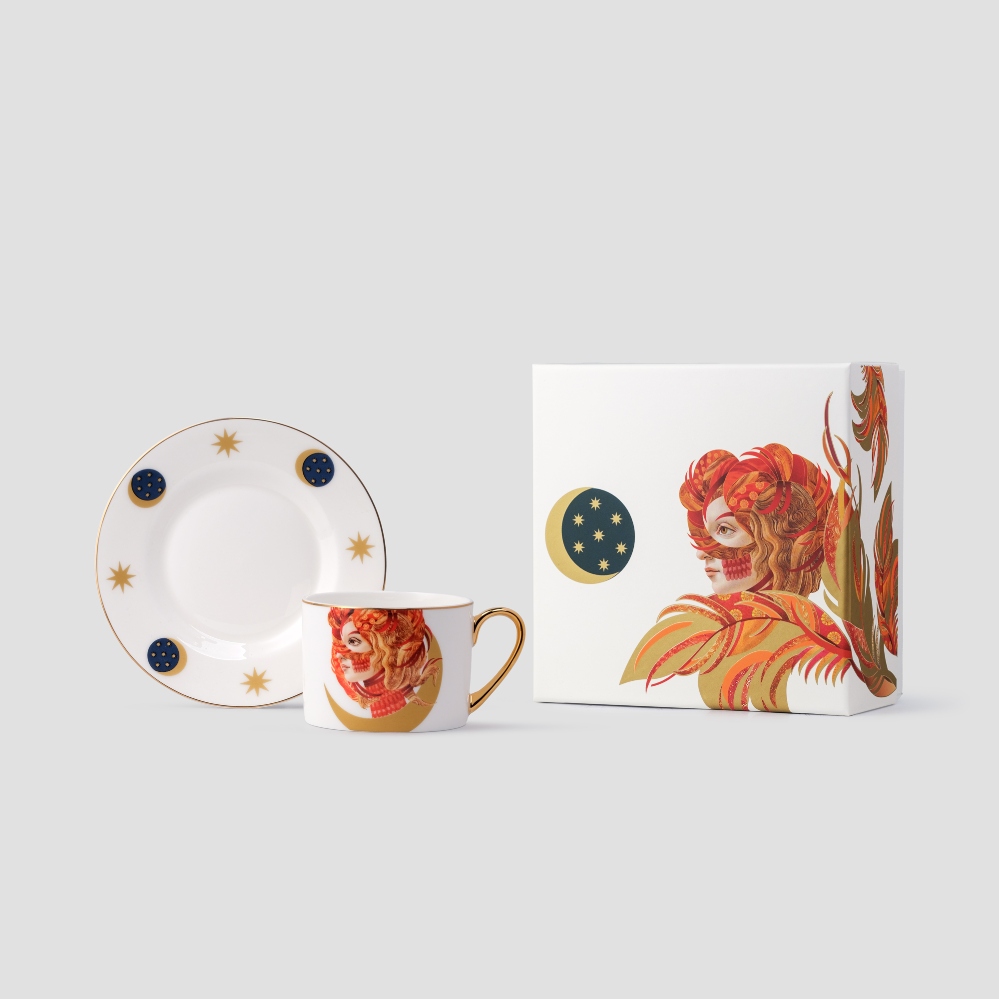 Чайная пара «Жар-птица» из одноименной коллекции поставляется в подарочной коробке «крышка-дно» с матовой ламинацией.