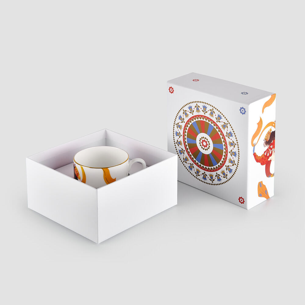 Чайная пара «Жар-птица» из коллекции «Яркое представление» поствляется в подарочной коробке «крышка-дно» с матовой ламинацией.