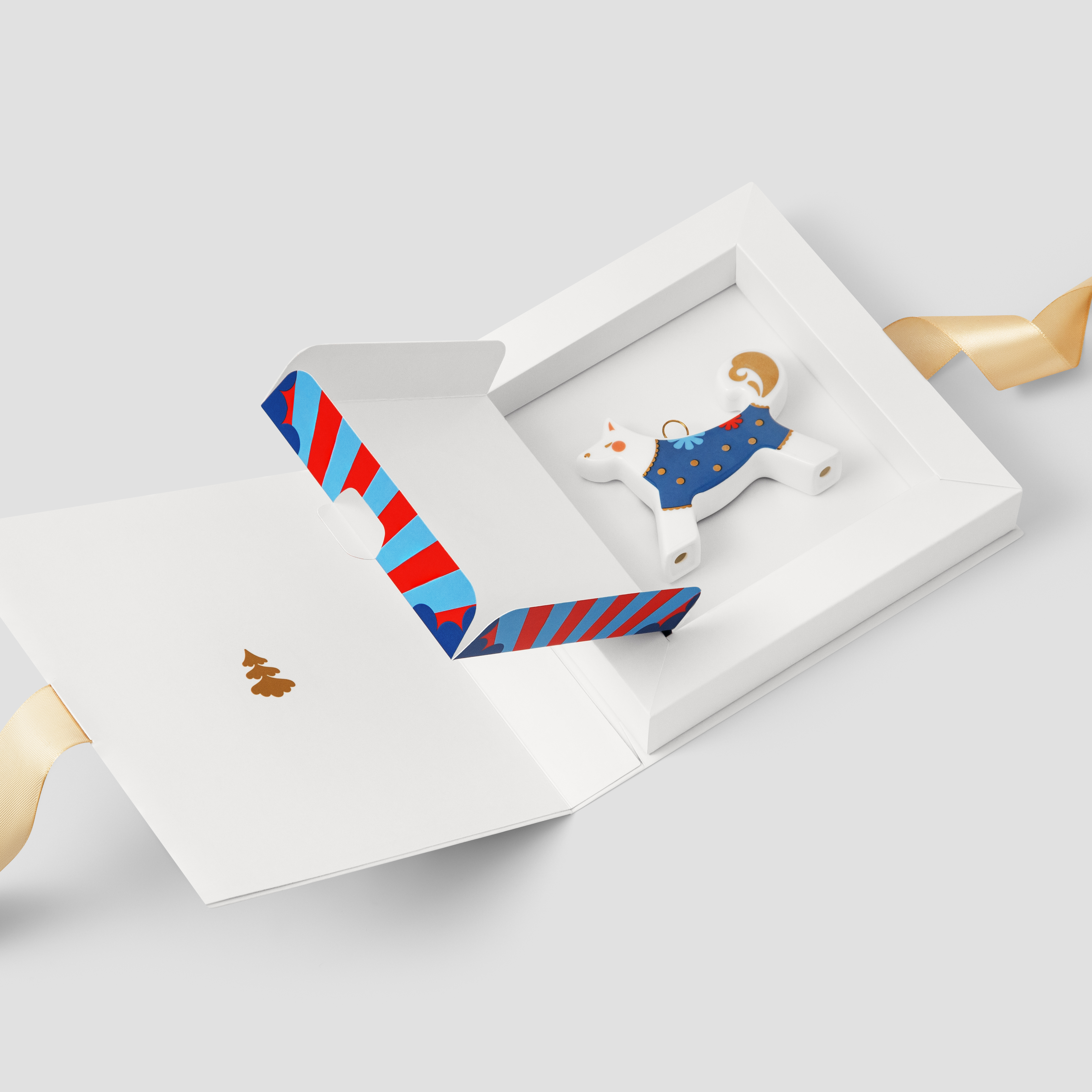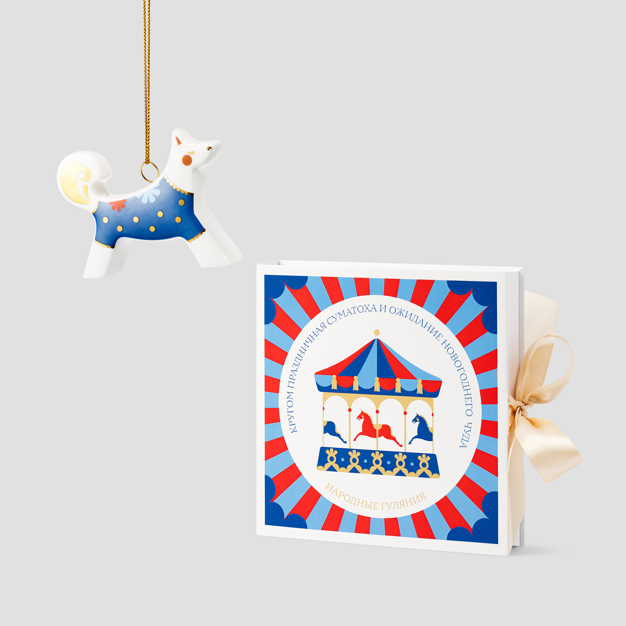 Елочная игрушка «Собачка» из коллекции «Народные гуляния» поставляется в подарочной коробке с матовой ламинацией на лентах.