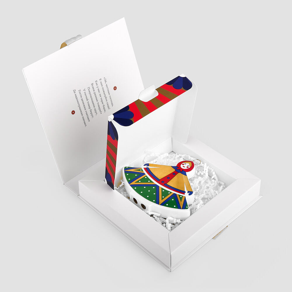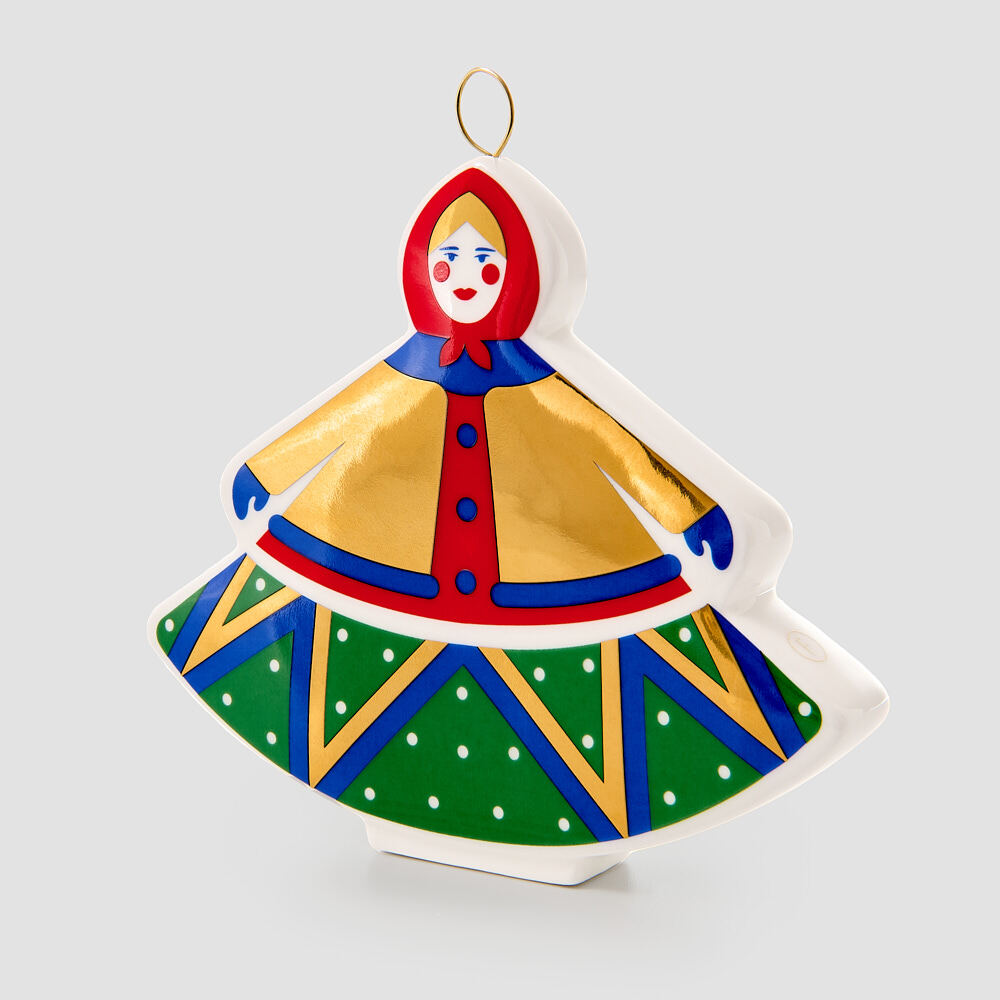 Елочная игрушка «Дама» из коллекции «Зимняя ярмарка» поставляется в подарочной коробке с матовой ламинацией на лентах.