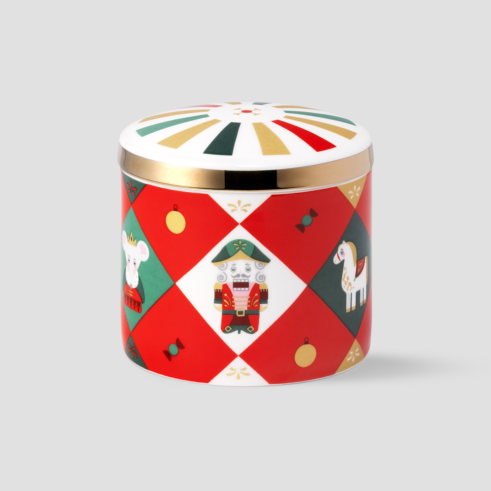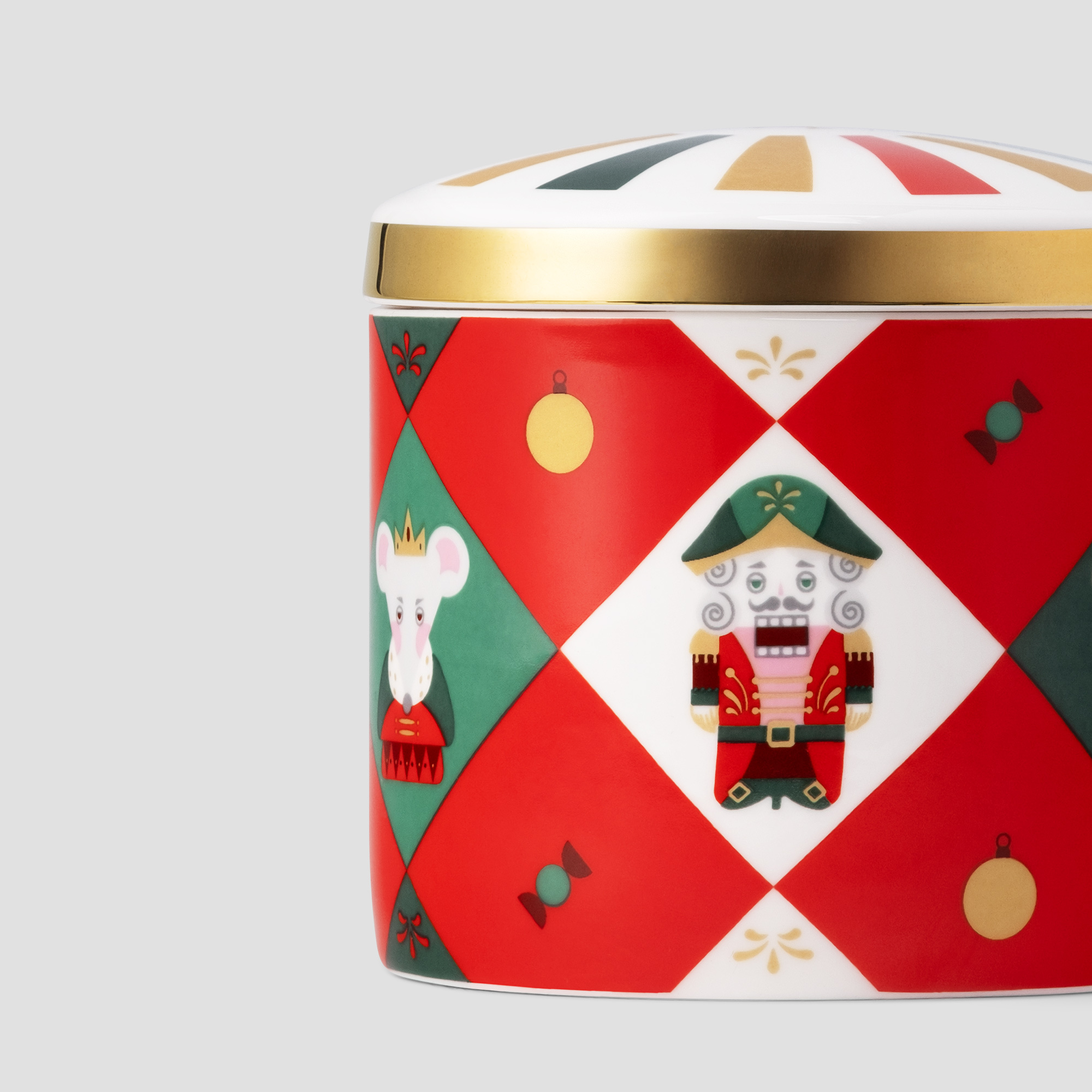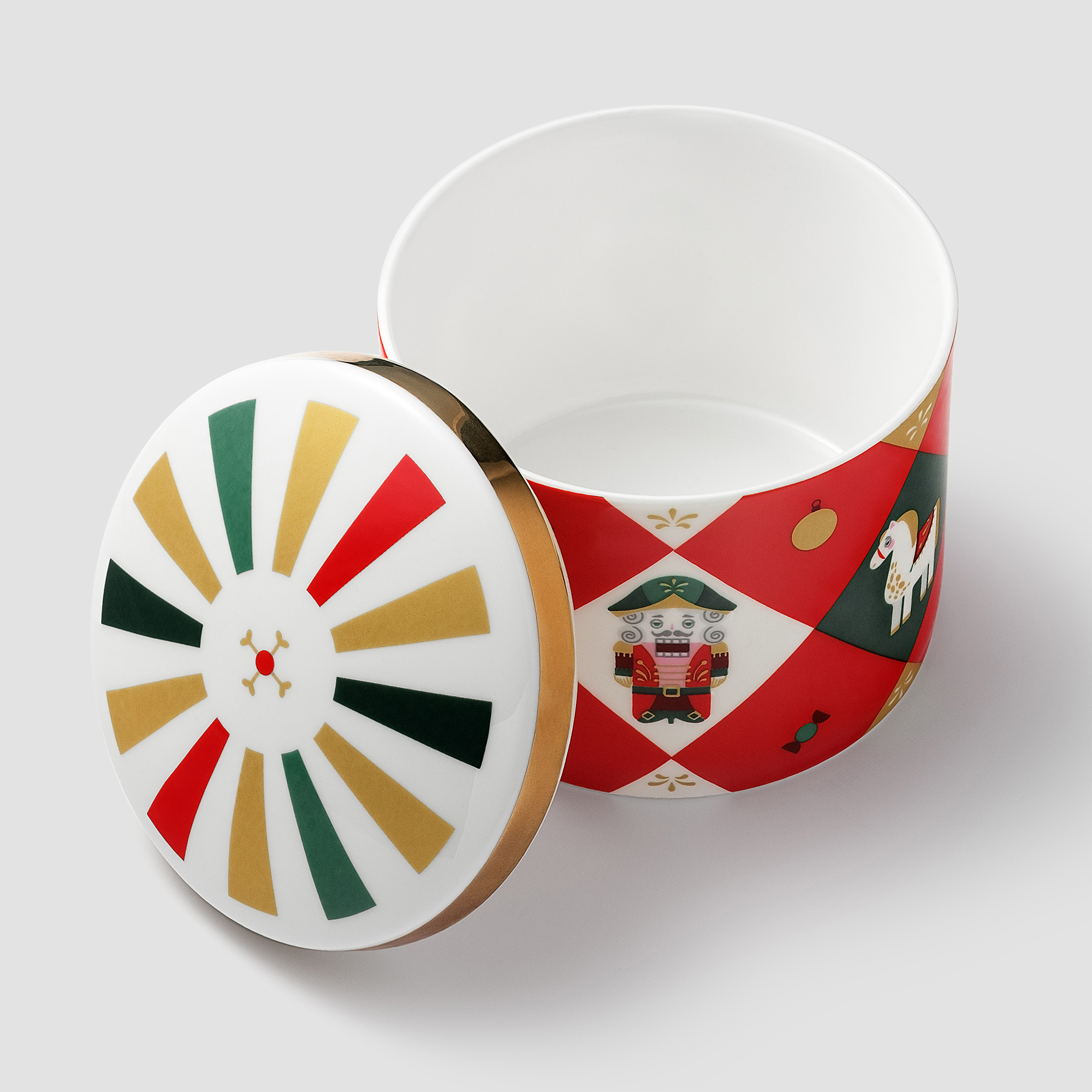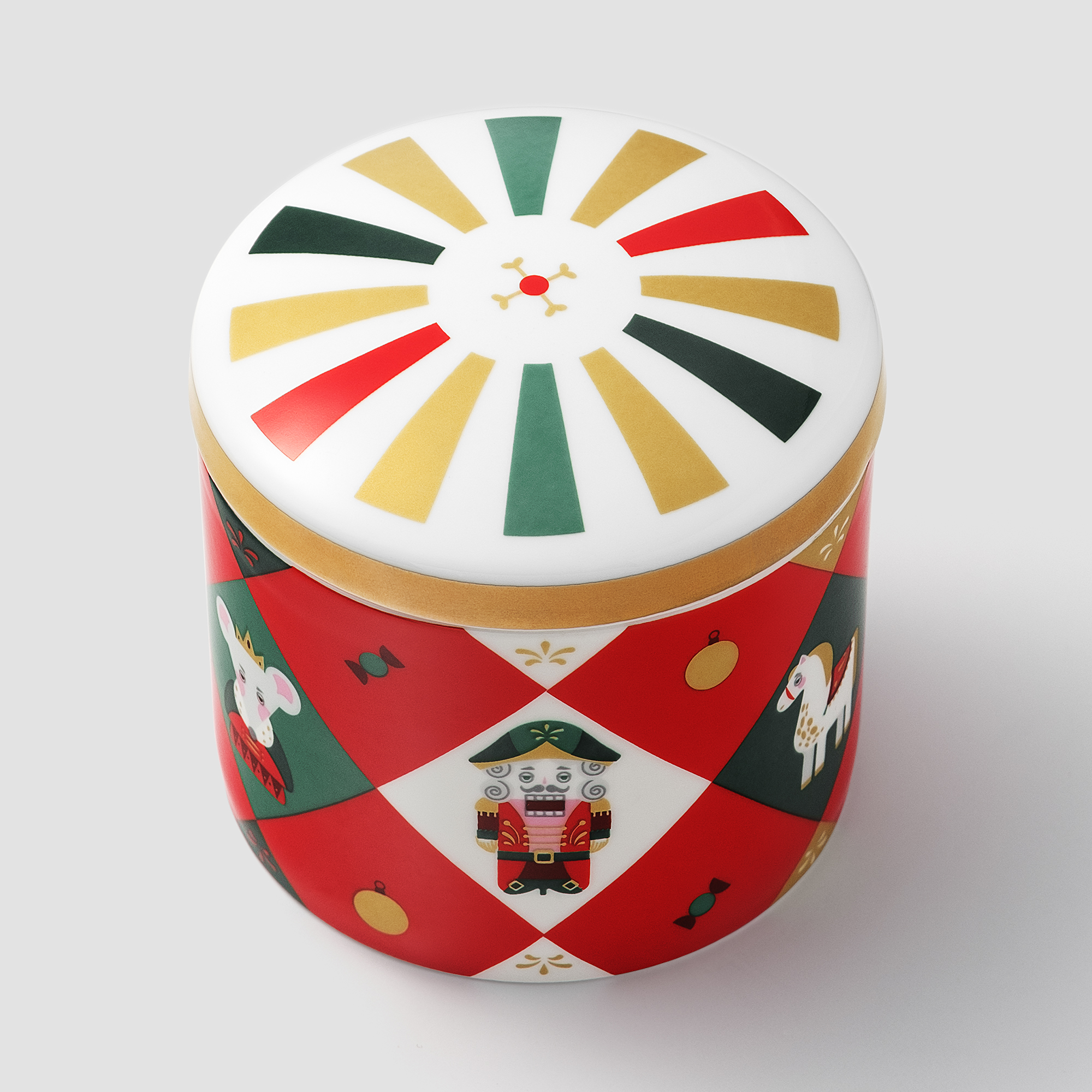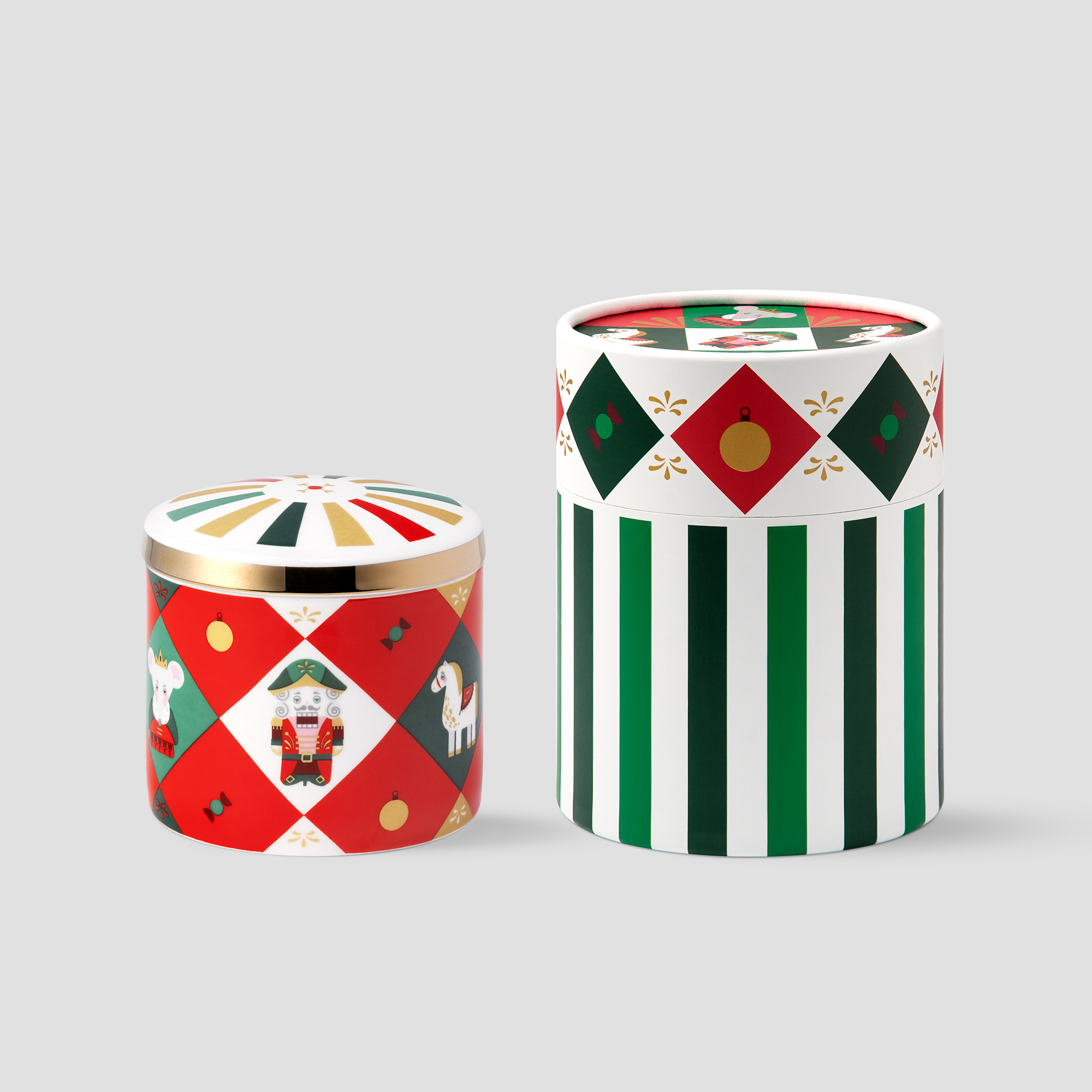 Емкость для хранения «Щелкунчик рождественский» из одноименной коллекции поставляется в подарочном тубусе-футляре с матовой ламинацией.