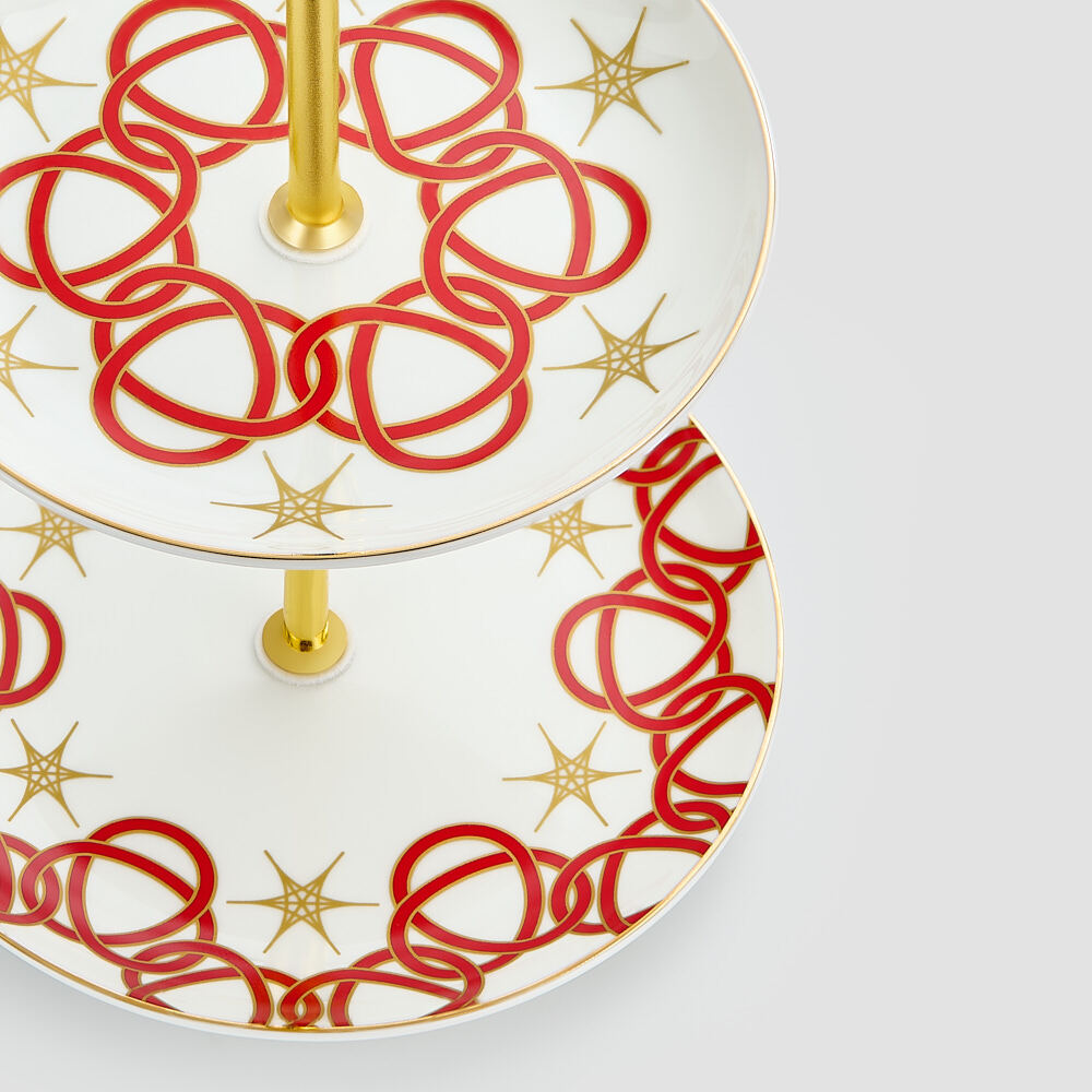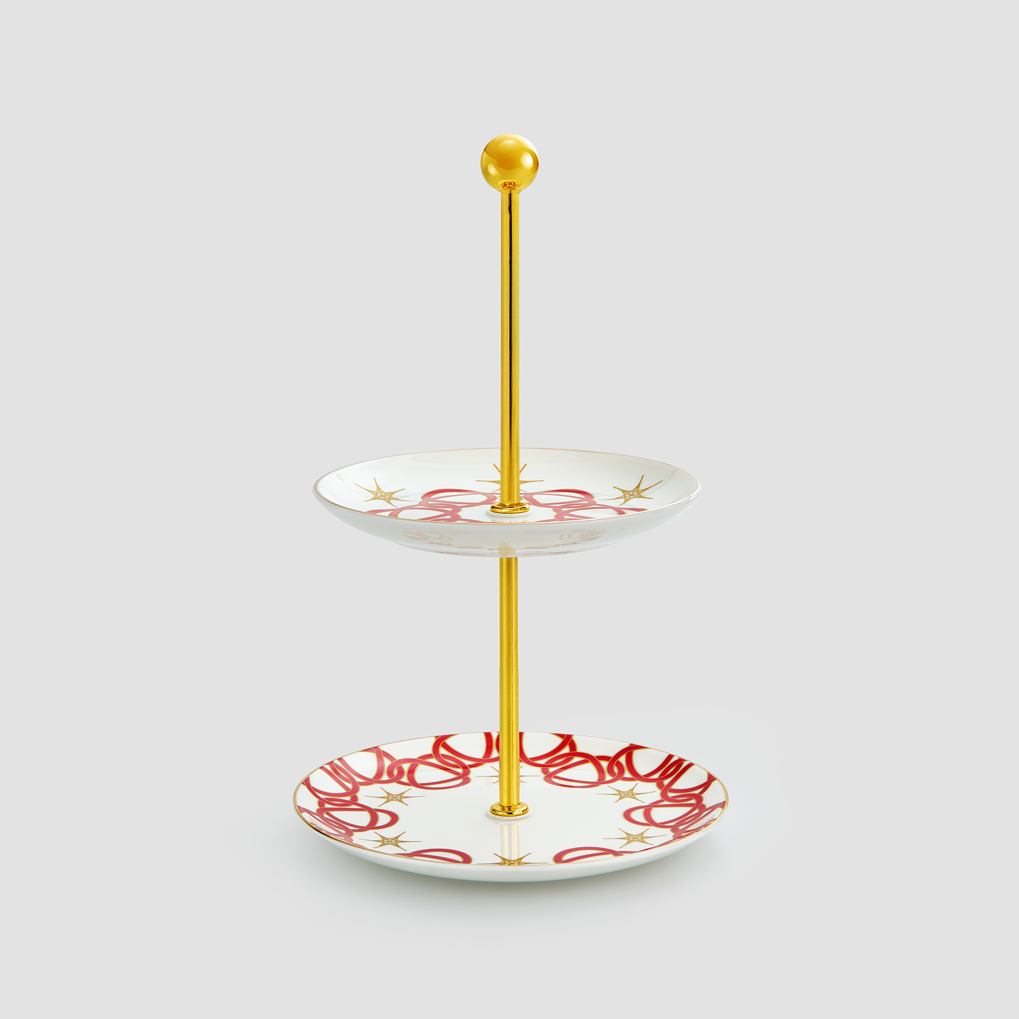 Этажерка «Гордиев узел» из одноименной коллекции в подарочной коробке состоит из двух тарелок и основания.