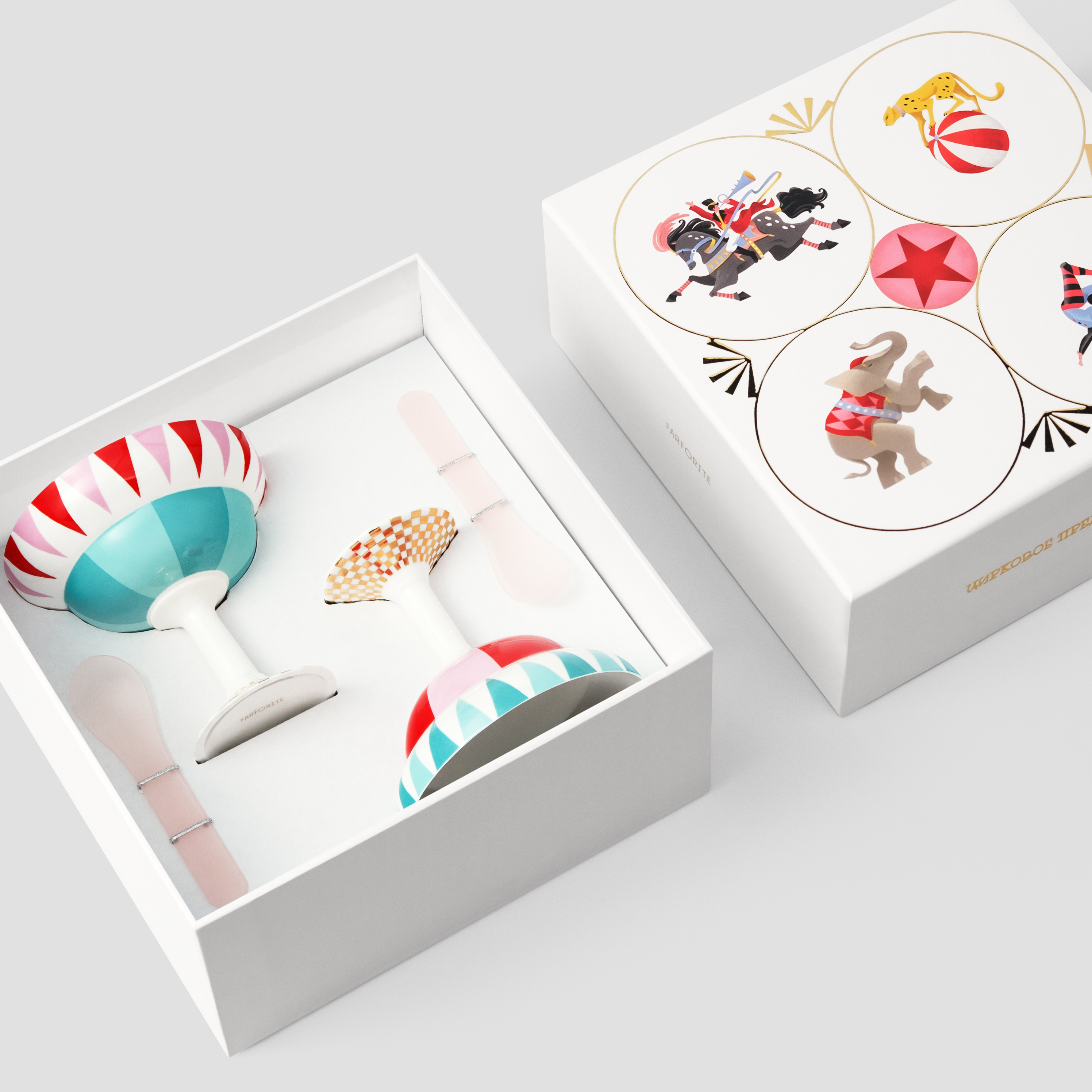 Набор из 2 креманок и 2 ложек «Цирковое представление» из одноименной коллекции поставляется в подарочной коробке «крышка-дно» с матовой ламинацией.