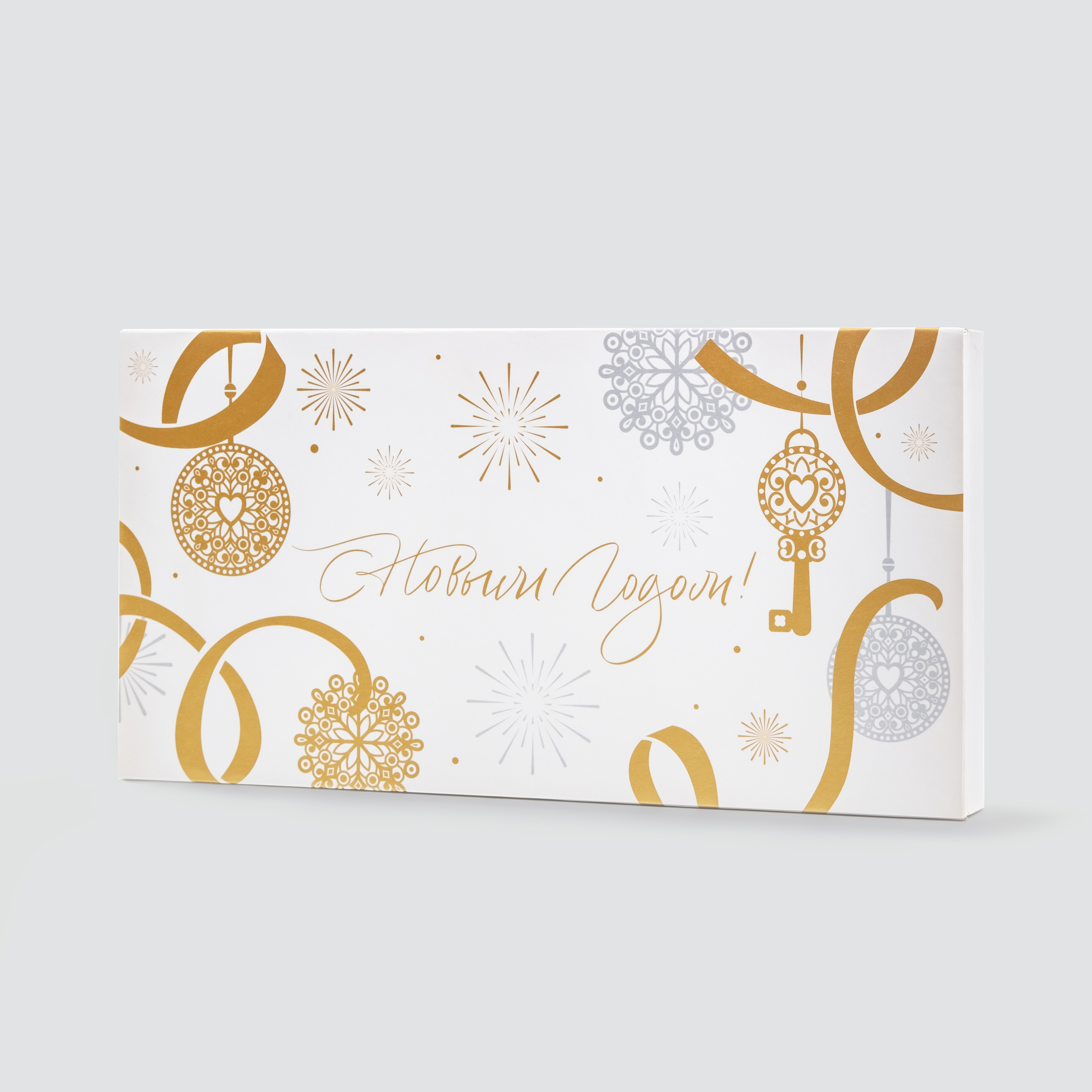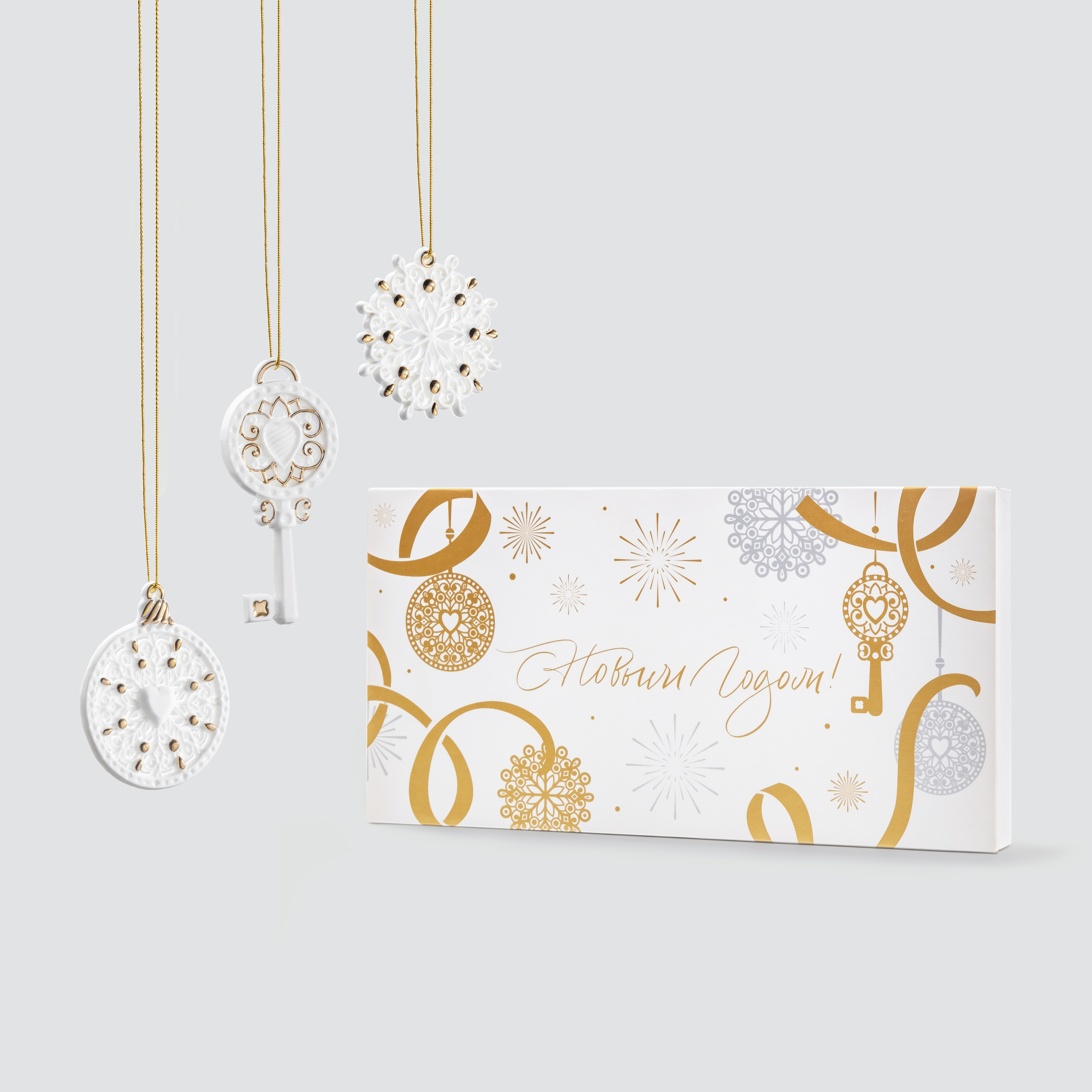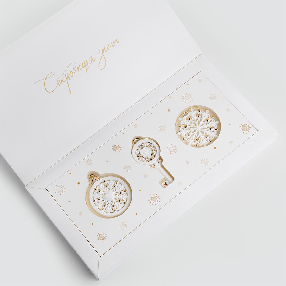 Набор из 3 игрушек «Сокровища зимы» поставляется в подарочной коробке на магнитах с матовой ламинацией. Состоит из елочных игрушек: «Ключик», «Шар», «Снежинка».