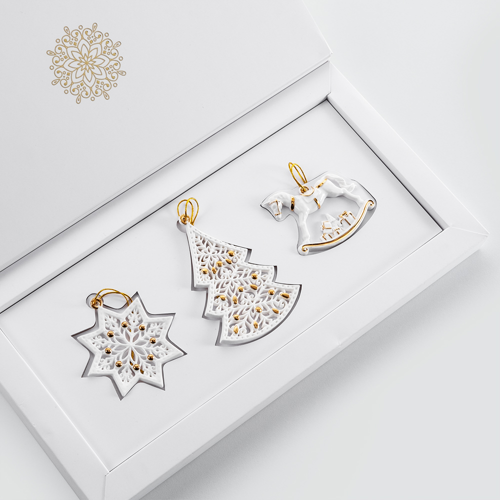 Набор из 3 игрушек «Зимнее кружево» поставляется в подарочной коробке на магнитах с матовой ламинацией. Состоит из елочных игрушек: «Снежинка», «Лошадка», «Елочка».