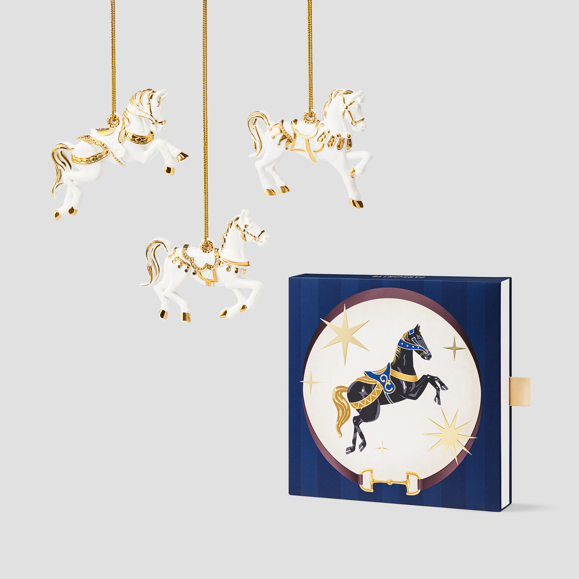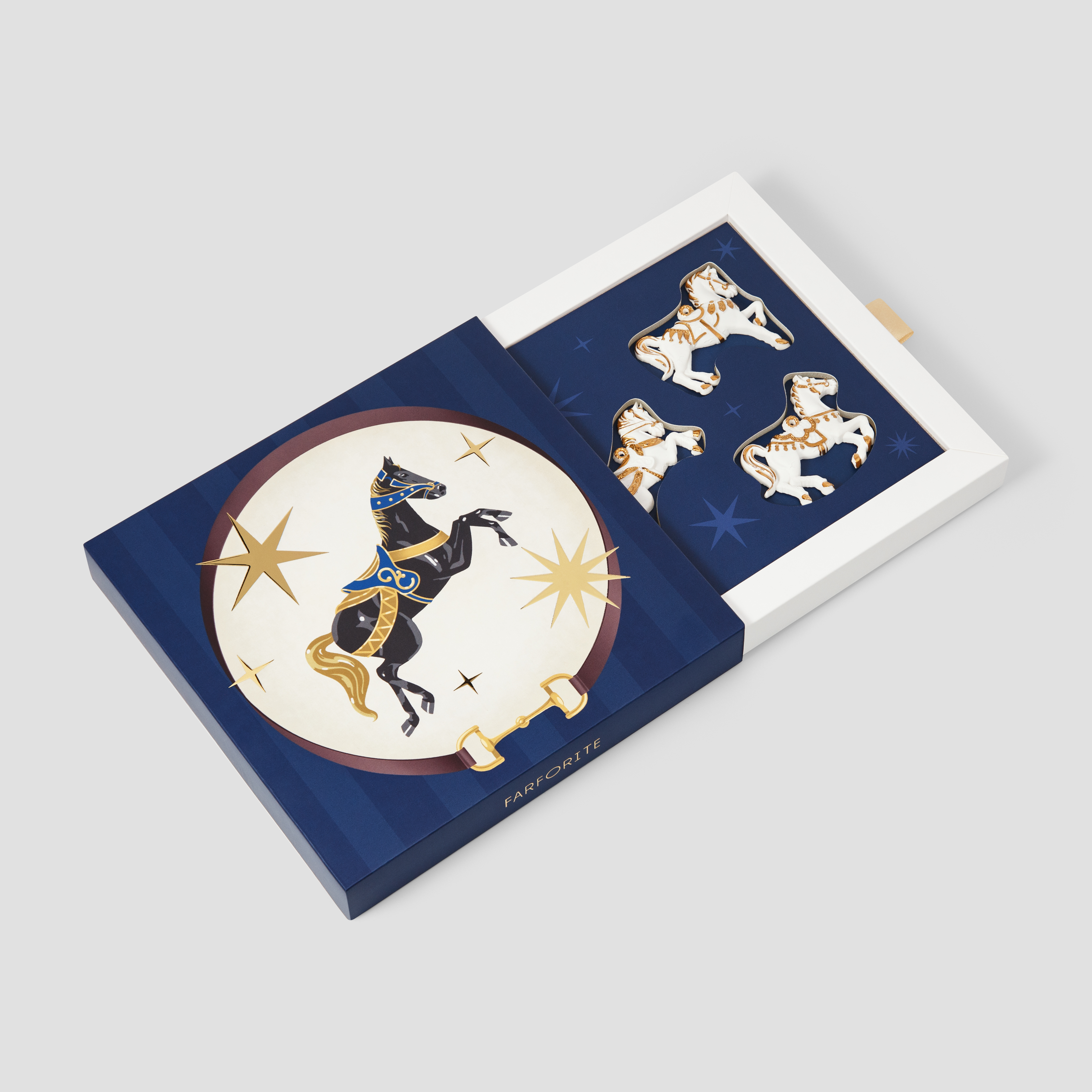 Набор из 3 елочных игрушек «Тройка белых лошадей» из одноименной коллекции поставляется в подарочной коробке-пенале с матовой ламинацией и лентой.