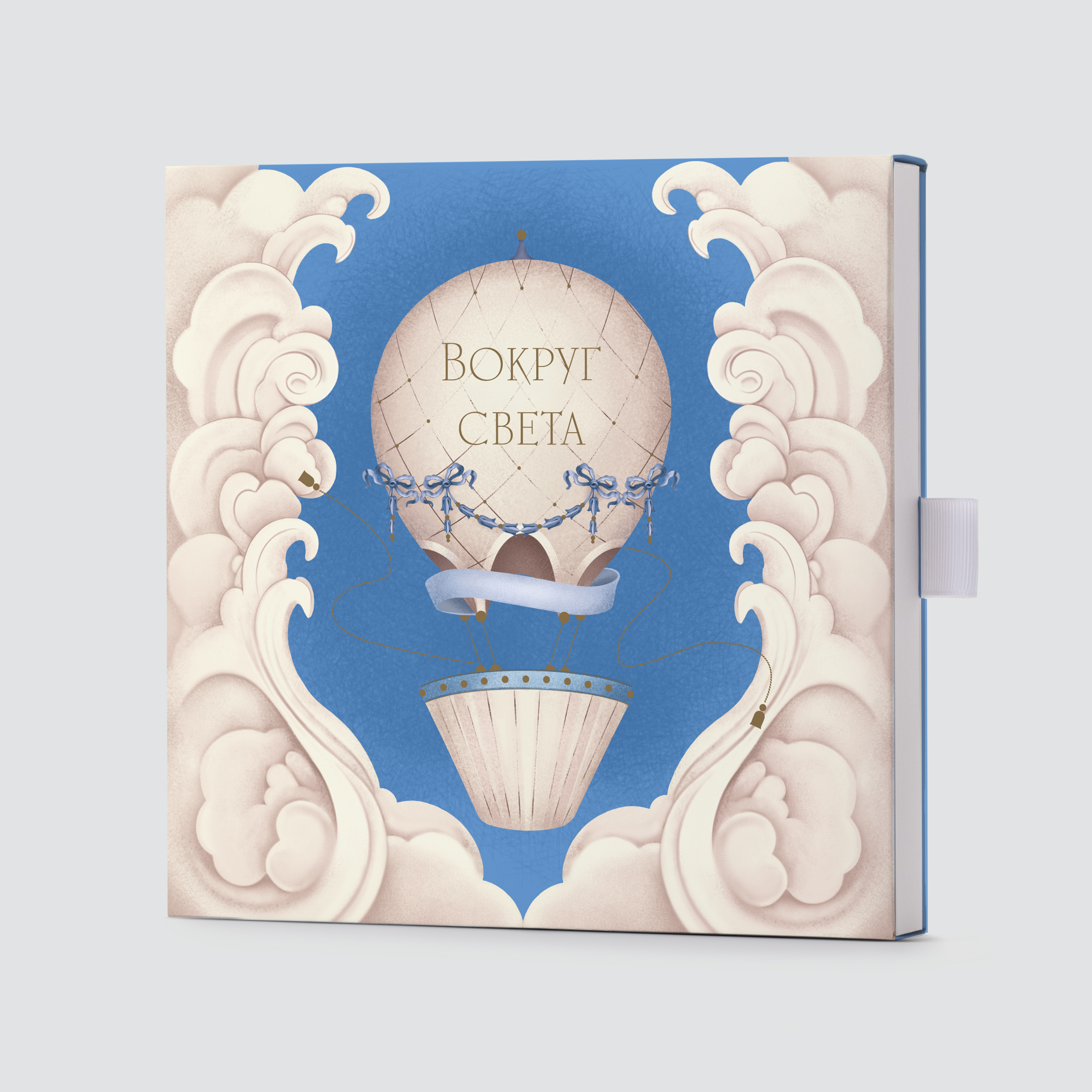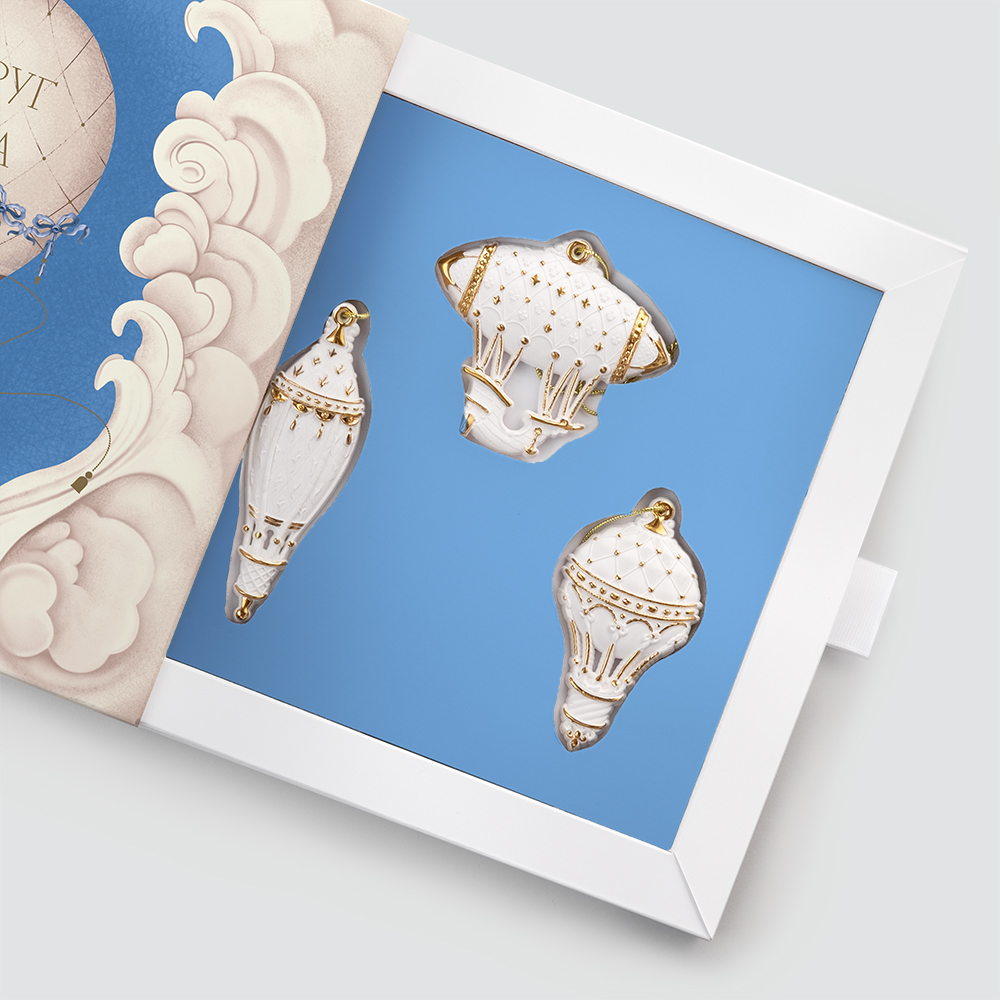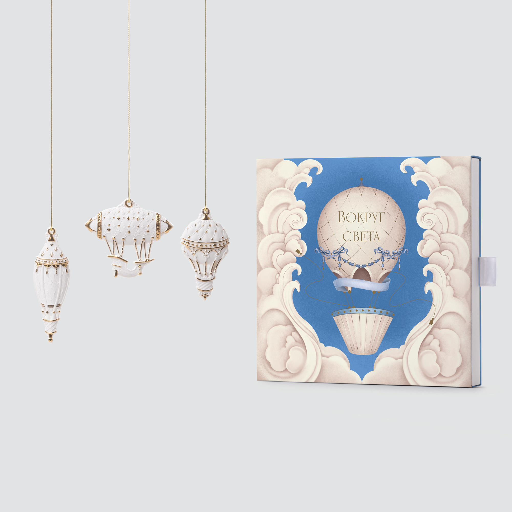Набор из 3 игрушек  «Вокруг света» поставляется в подарочной коробке-пенале с лентой и матовой ламинацией. Состоит из елочных игрушек: «Вытянутый воздушный шар», «Воздушный шар», «Воздушный шар-корабль».