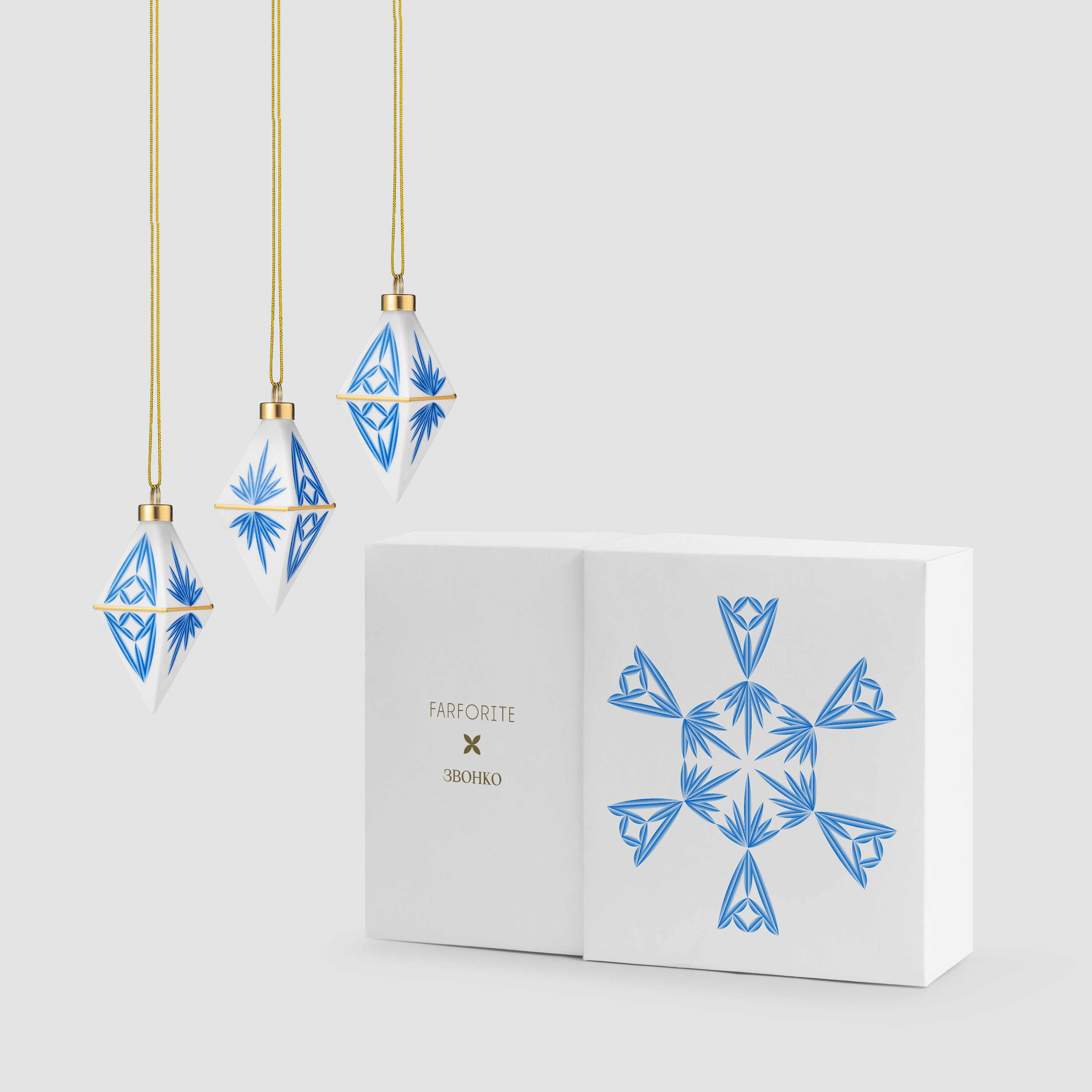 Набор из 3 елочных игрушек «Звонко» из одноименной коллекции поставляется в подарочной коробке с матовой ламинацией.