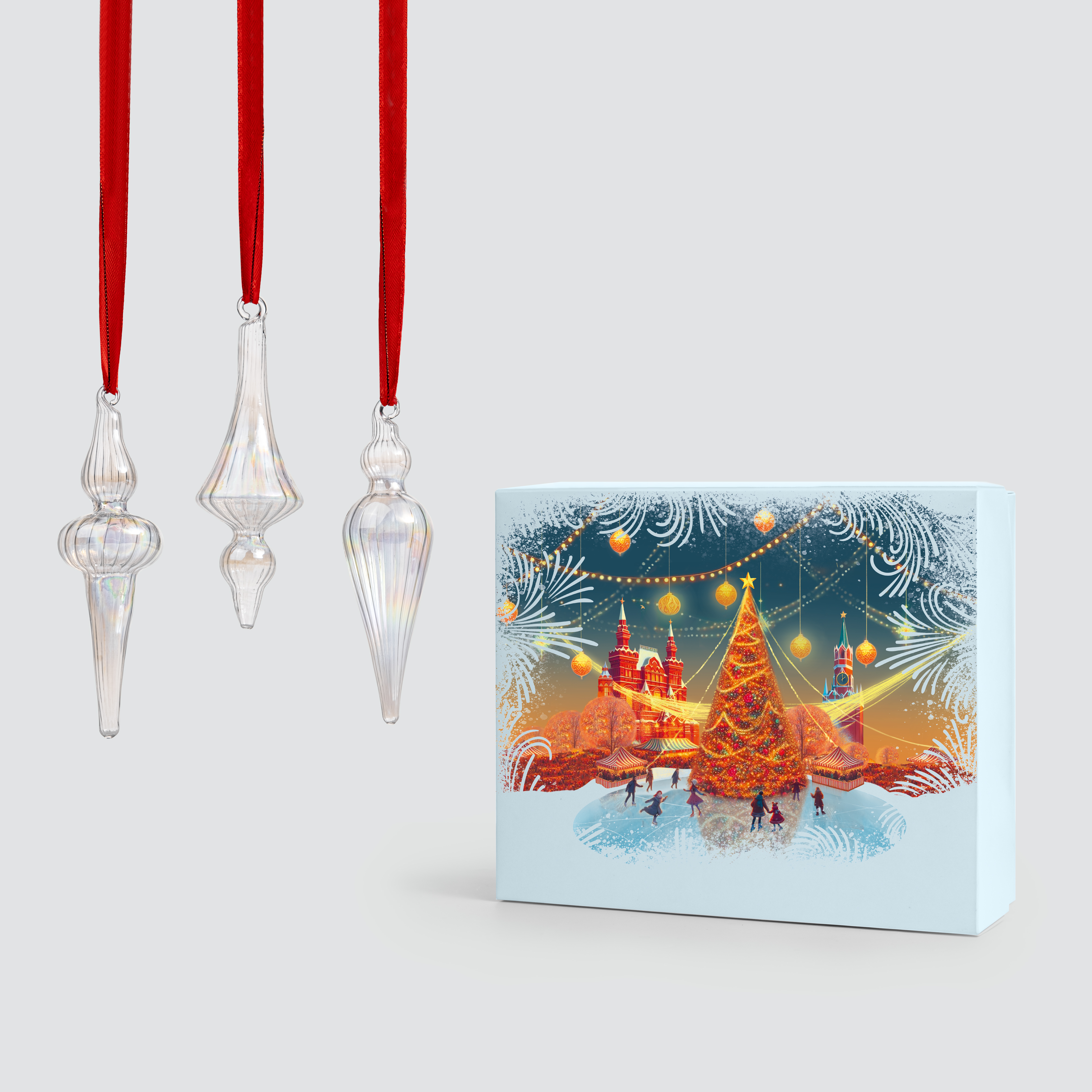 Набор из 3 елочных игрушек-сосулек «Главная елка страны» поставляется в подарочной коробке «крышка-дно» с матовой ламинацией.