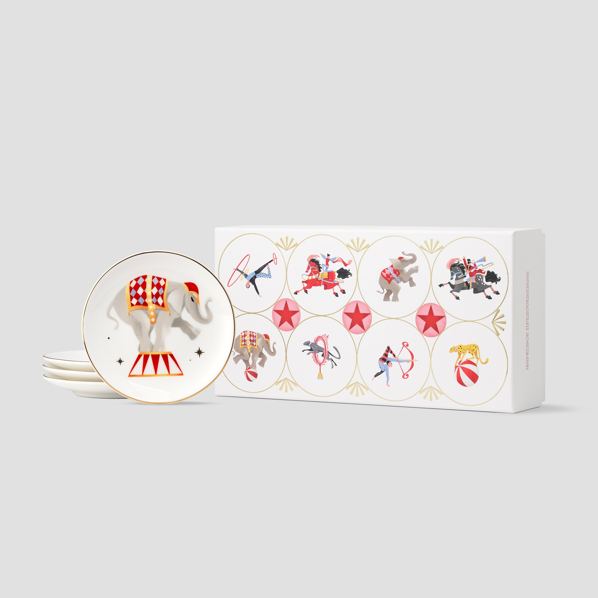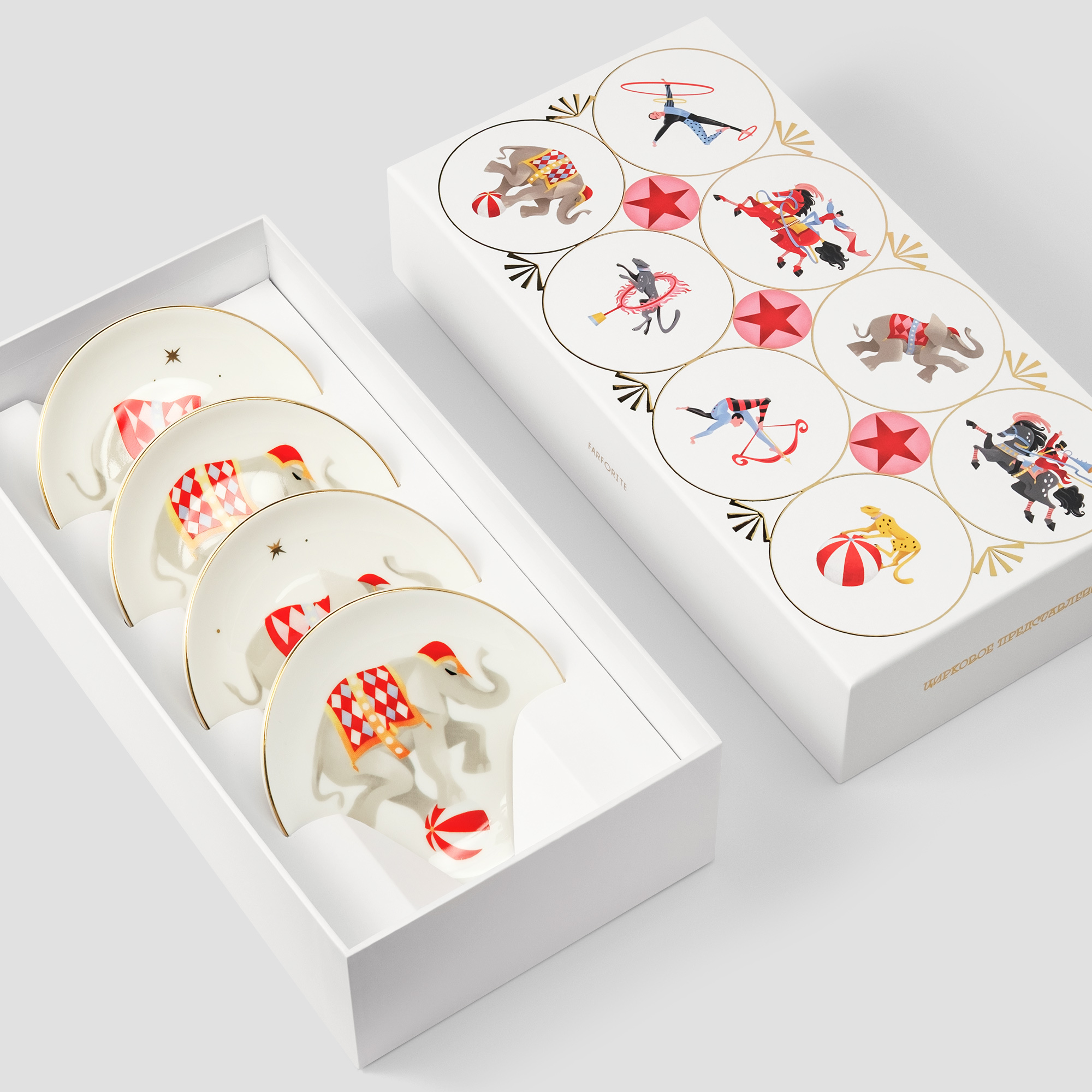 Набор из 4 блюд для закусок «Цирковое представление» из одноименной коллекции поставляется в подарочной коробке «крышка-дно» с матовой ламинацией.