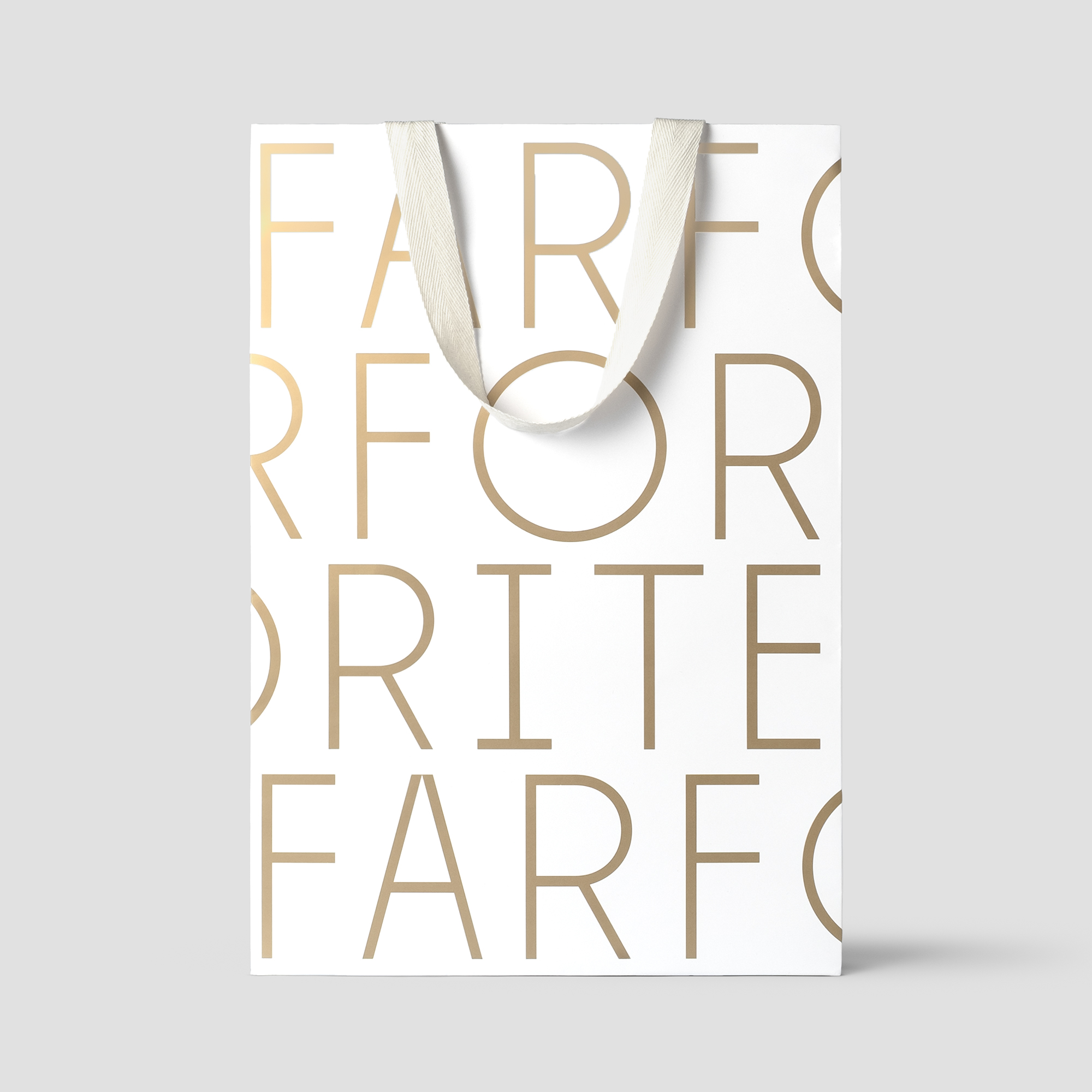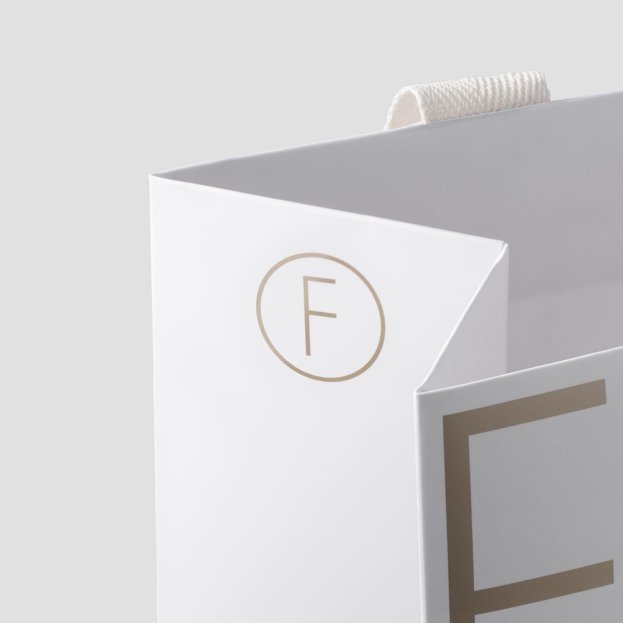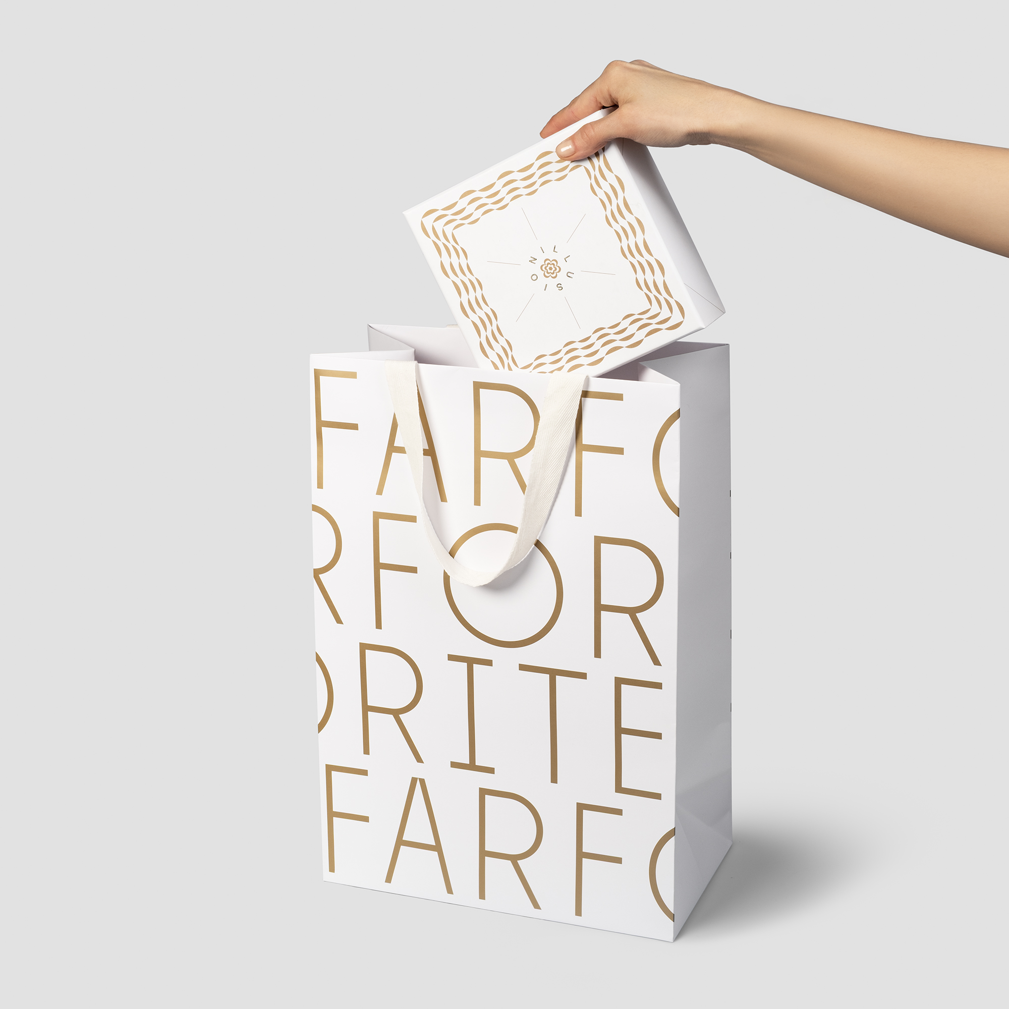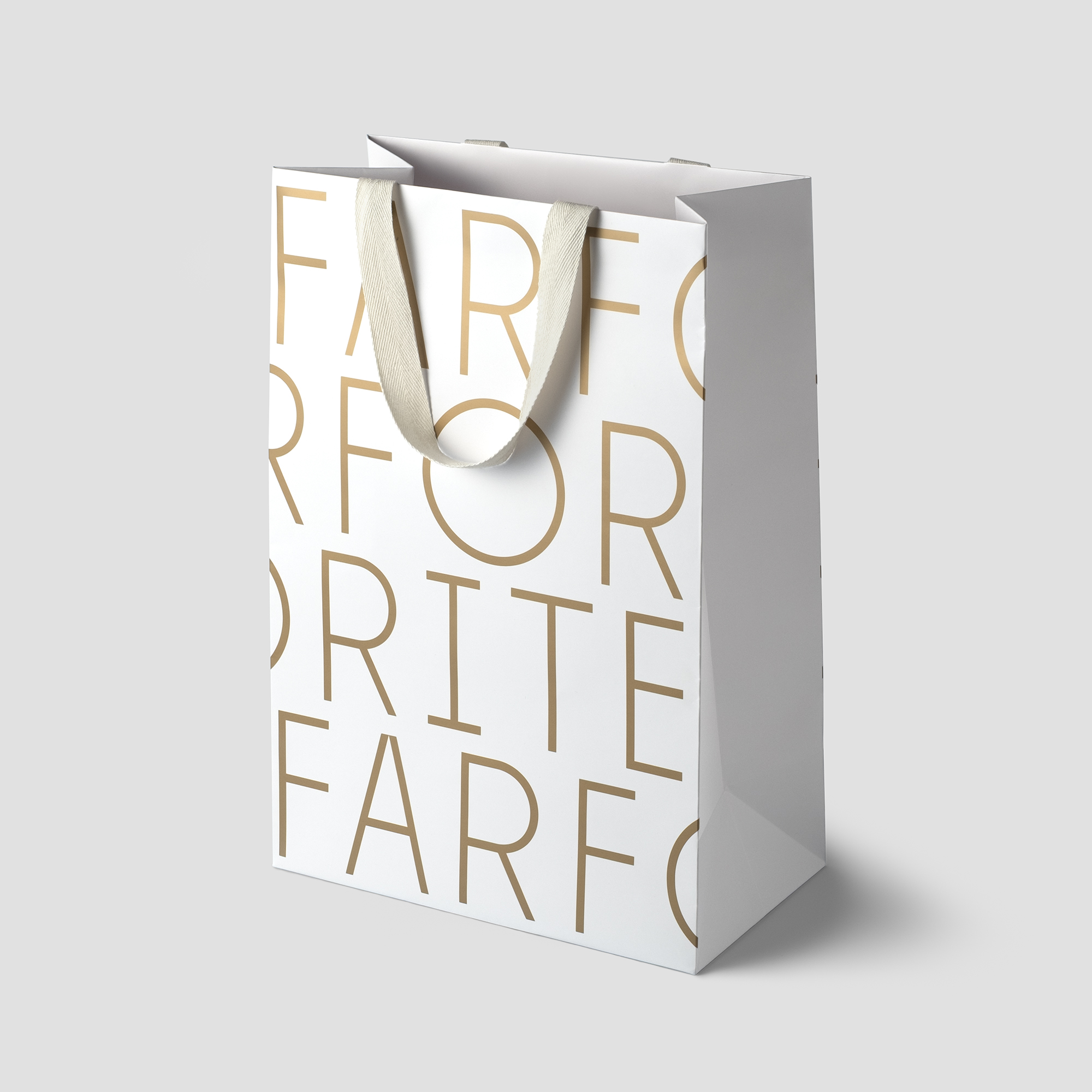 Фирменный подарочный пакет «Средний» из плотной бумаги с матовой ламинацией и ручками из киперной ленты. Длина ручек: 2,5 см.